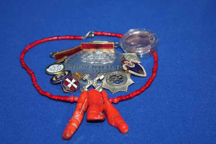LOT OF JEWELLERY AND COLLECTABLES including unusual RSPCA medallion, beaded necklace, badges, etrc