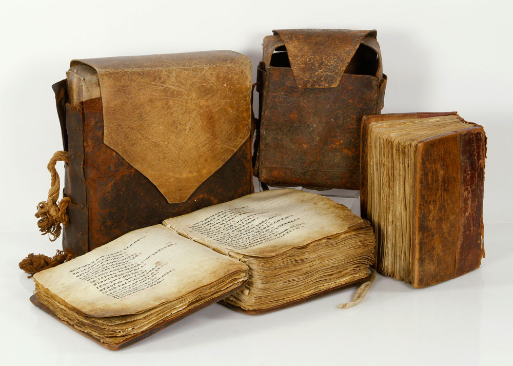 handwritten, with hand-crafted wooden covers and leather cases, 9" sq (largest); Amharic bibles were sold to antique dealers in Nairobi, Kenya, by refugees from Ethiopia in the 1980's. They are ancient, written in Amharic, a version of the old Ge'ez
