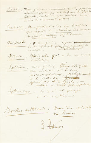 Autograph Manuscript Signed ("L. Pasteur"), 1 p, 8vo, n.p., n.d. [circa 1882?], with numerous additions and deletions, light pencil circle mark to lower half of document. Matted and framed.