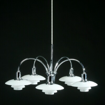 “Cascade”. Chromium-plated chandelier, five branches with 2/1 opal glass shades