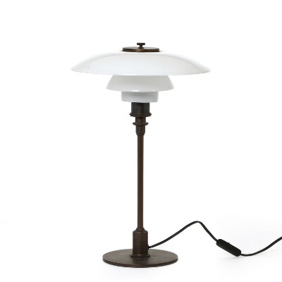 A jubilee patinated brass table lamp, multi layer opal glass shades