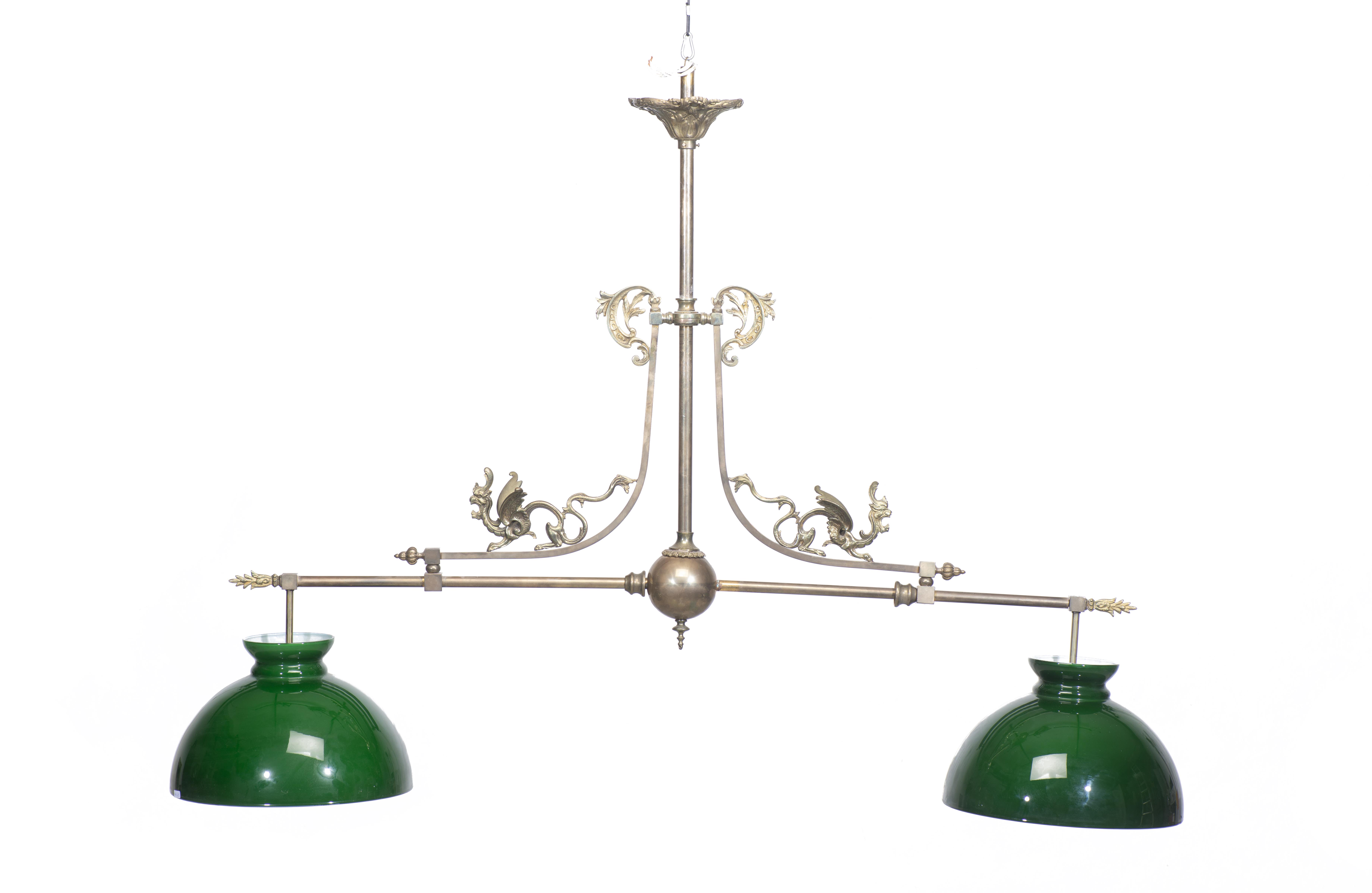 Lustre ou suspension de billard en laiton à 2 bras de lumière ornés de chimères et vasques en opalines vertes.