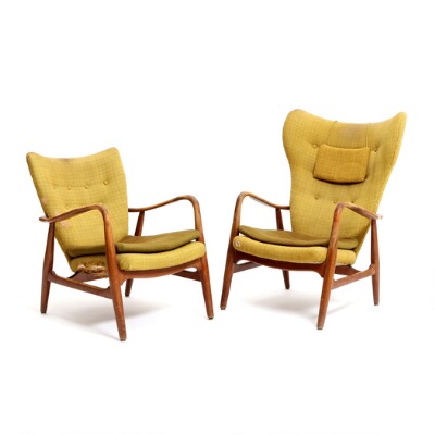 High- and low-backed easy chair with stained beech frame, yellowish green fabric