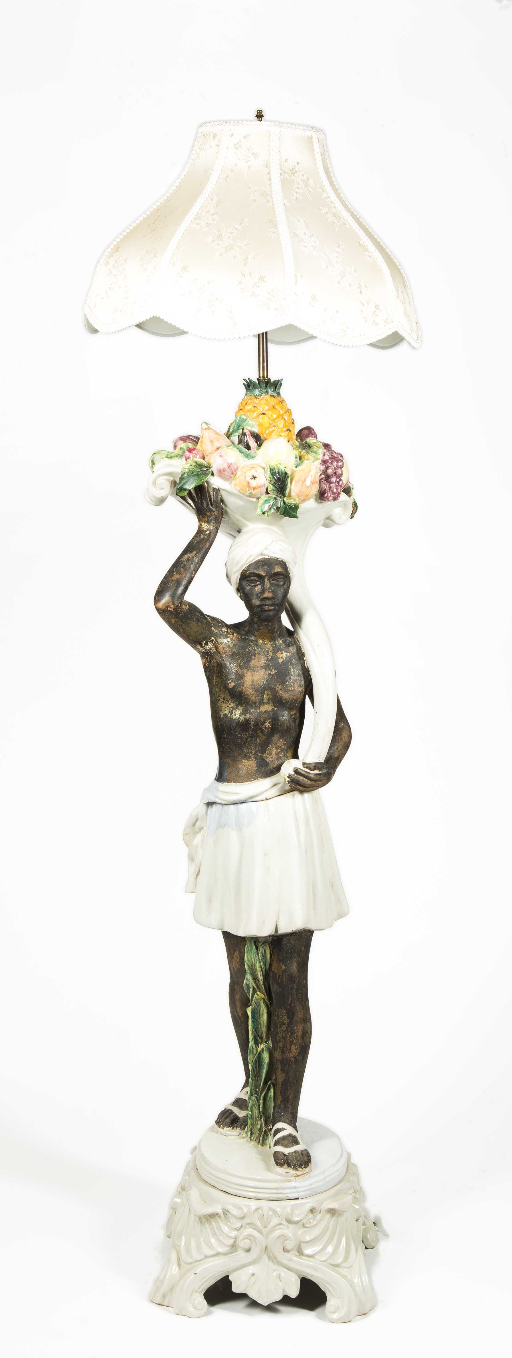 pottery lamp of a man holding a cornucopia of fruit, 60" tall including the finial, comes with a modern white satin type shade, marked on the bottom "For Marbro Italy"