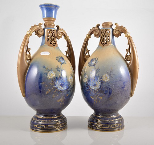 Meissen Bargeware teapot, applied flowers and plaque, Mrs G Leaf, Woodville 1898, height 18cm, a pair of pottery vases, rum decanter, table lamp, plated trays etc, (1 box).