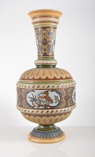 Mettlach bottle neck vase, the glazed stoneware body having a panel encircling the main body depicting a boy in a tree with various musical instruments, 33cm, mould number 1591.
