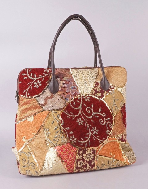 SAC CABAS en patchwork de velours broché et damas agrémenté de sequins, anses en agneau marron. 53 x 57 x 21 cm