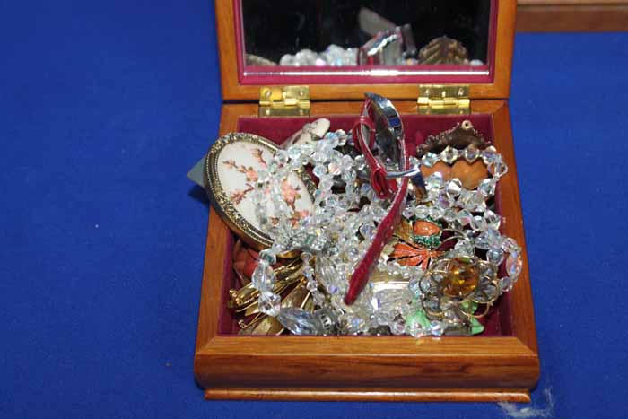 MIXED BROOCHES AND COSTUMEJEWELLERY in an inlaid box