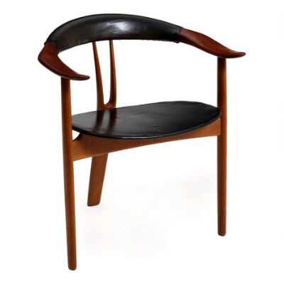 Three-legged armchair with oak frame and teak armrests, seat and back with black leather.