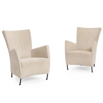 A pair of easy chairs with black-lacquered steel legs, upholstered with light alcantara