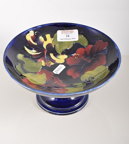 Moorcroft pottery pedestal bowl, flora pattern on a blue ground