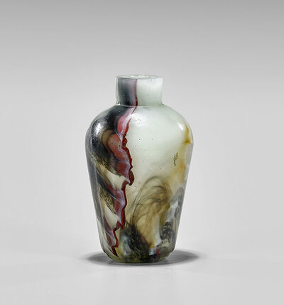 Chinese glass snuff bottle; the simple high-shouldered form decorated in layered swirls of black, red, white and yellow; H: 2 1/4"