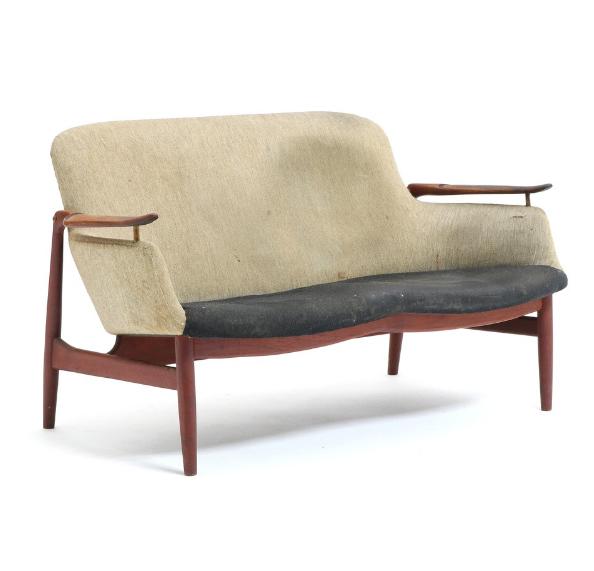 "FJ-53". Two seated sofa with floating armrests on brass fittings, upholstered with grey wool