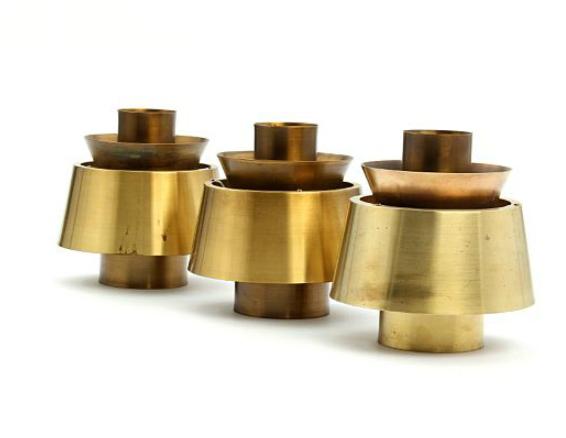 A set of three patinated brass pendants