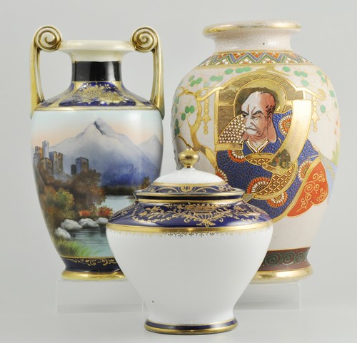 with domed cover, a similar two handled baluster vase and a Japanese Satsuma style baluster vase, decorated with enamel, (3).