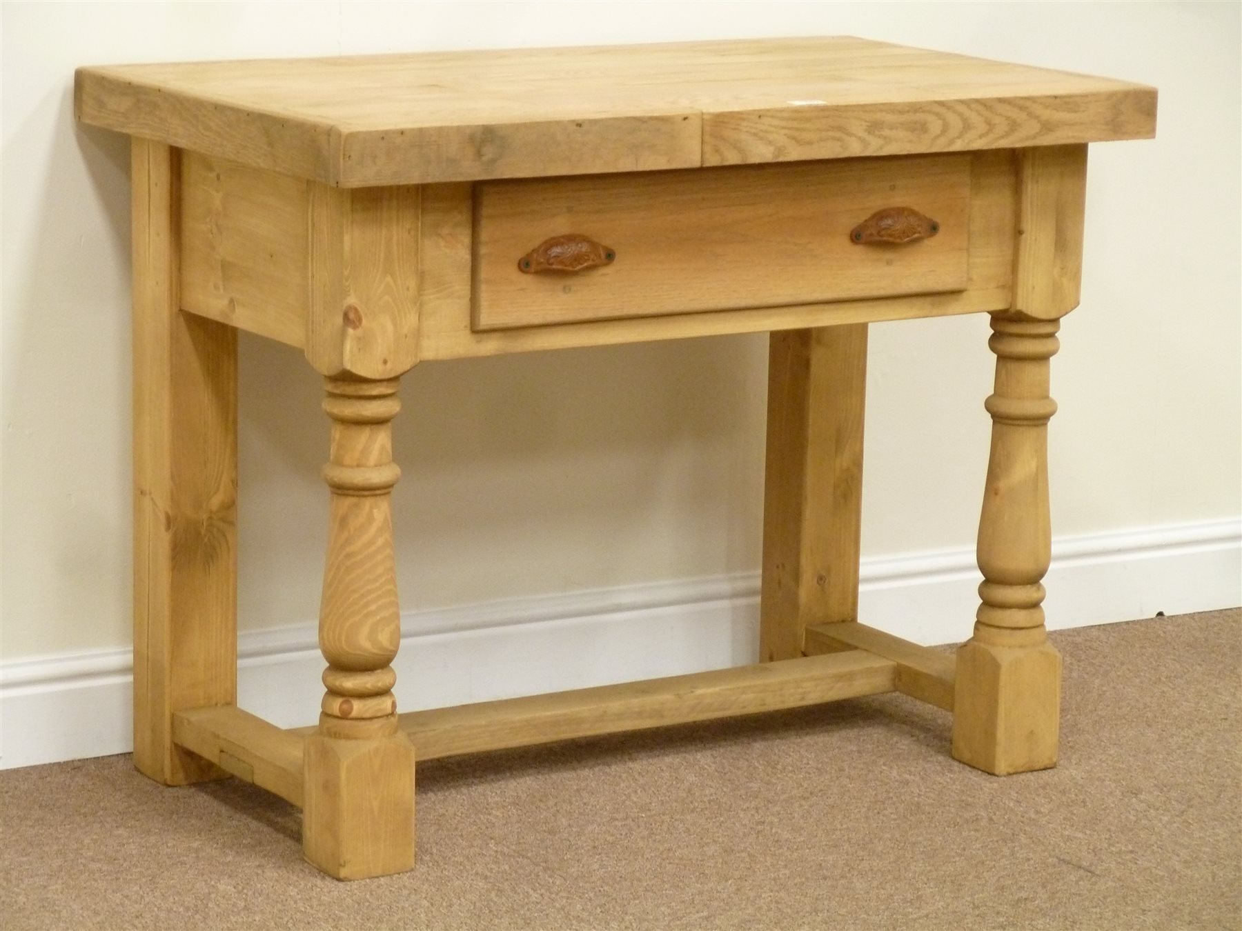 Oak 'butchers block' top dresser fitted with single drawer on turned pine stretcher base