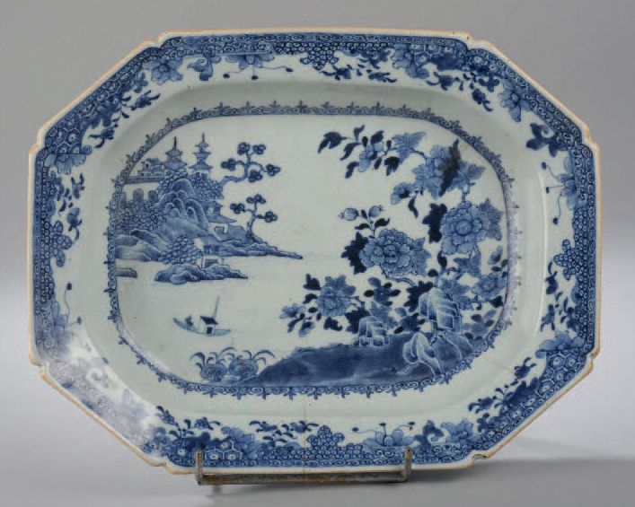 Octagonal dish porcelain India Company decorated in cobalt blue underglaze of a lakeside path