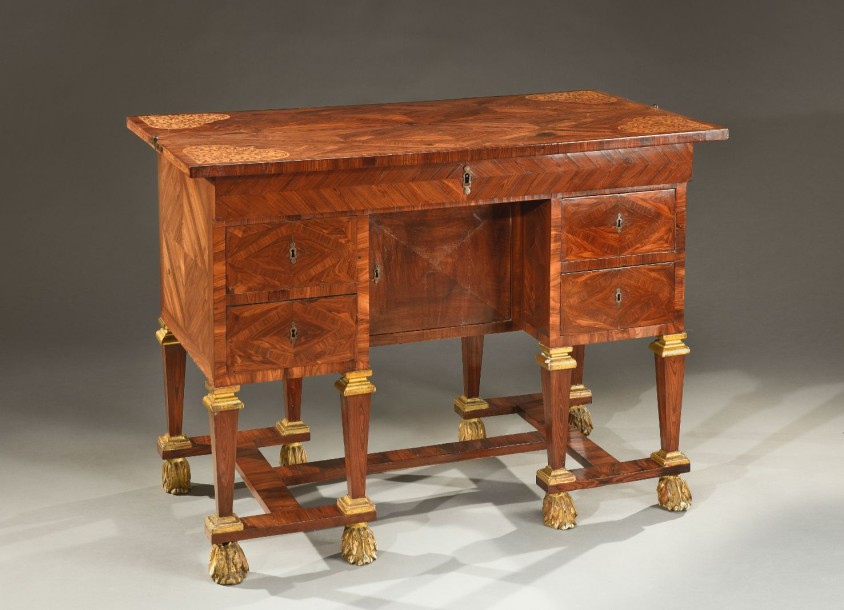 Mazarin desk in rosewood veneer and light wood marquetry, with a geometric and foliated decor on top, broken on three drawers on a box opening by four drawers and a central leaf in recess. It rests on an eight-foot base in sheath connected by a doubl