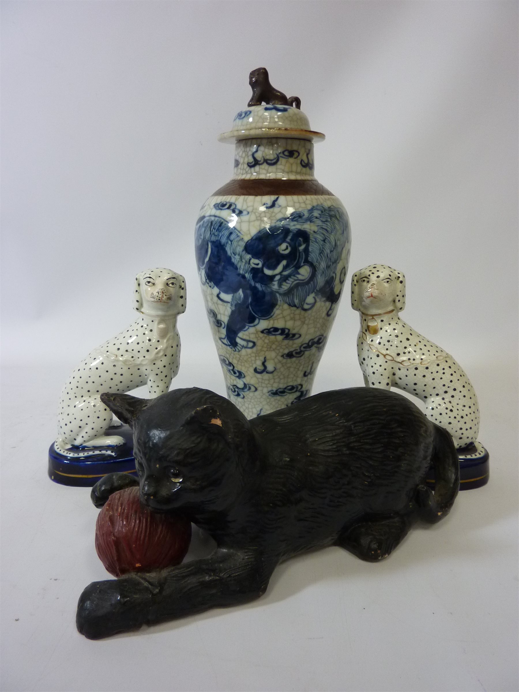 Oriental vase H31cm, pair Staffordshire Dalmatian dog ornaments, and a Bretby cat