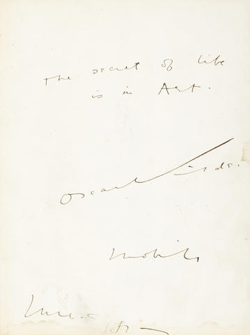 Autograph Quotation Signed ("Oscar Wilde"), 1 p, 4to, Mobile, [Alabama], June, 1882, edges lightly stained and with short closed tears. Matted and framed with portrait.