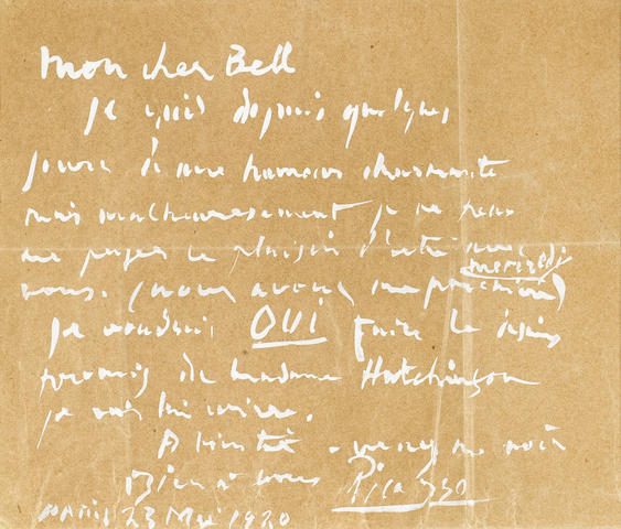 Autograph Letter Signed ("Picasso"), 1 p, oblong 4to, Paris, May 23, 1920, written in white gouache paint on wrapping paper, to CLIVE BELL, with holograph transmittal envelope, wrapping paper faded to brown. Matted and framed. Provenance: Sotheby's,