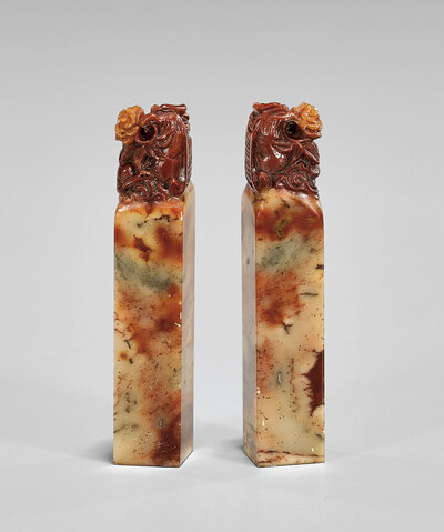 Pair of Chinese carved soapstone seals; the pale cream stone mottled with rich red suffusions; each of vertical square section, surmounted by a finely carved phoenix; the bases unworked; 18th/19th Century; H: 3 1/4" (each)