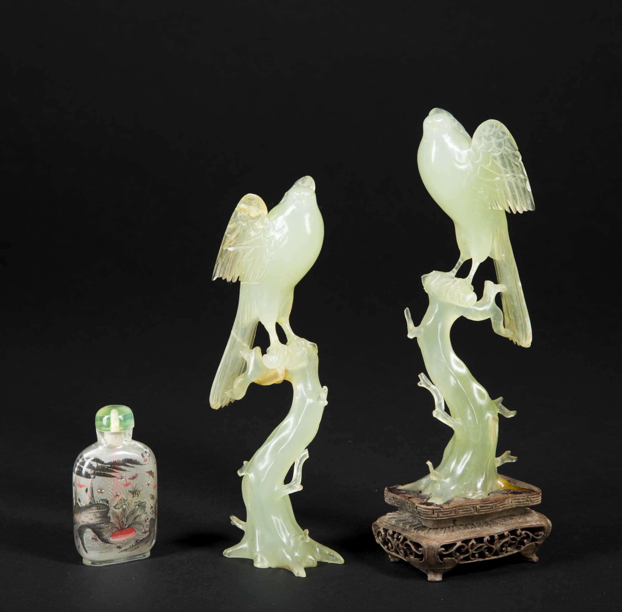 the pale green jade birds are approximately 7 1/8" tall, one wooden base, one bird has wing damage, 19th/20thC, the reverse painted glass snuff has floral and bird designs