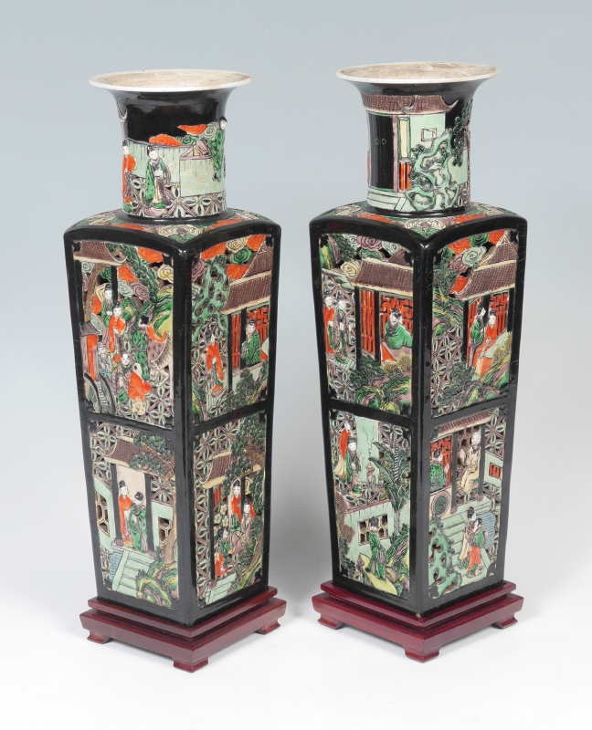 PAIR CHINESE FAMILLE NOIR RETICULATED VASES
