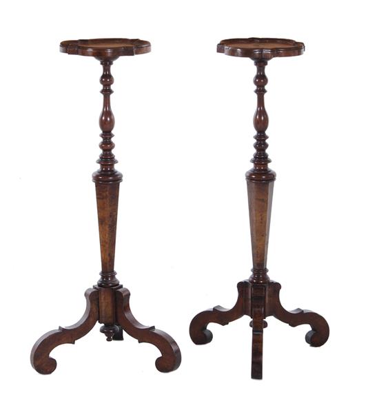 Pair Georgian walnut pedestal stands early 19th century, shaped molded edge top, turned pedestal, scrolling legs; H36 1/2" W17" D17" (2pcs)