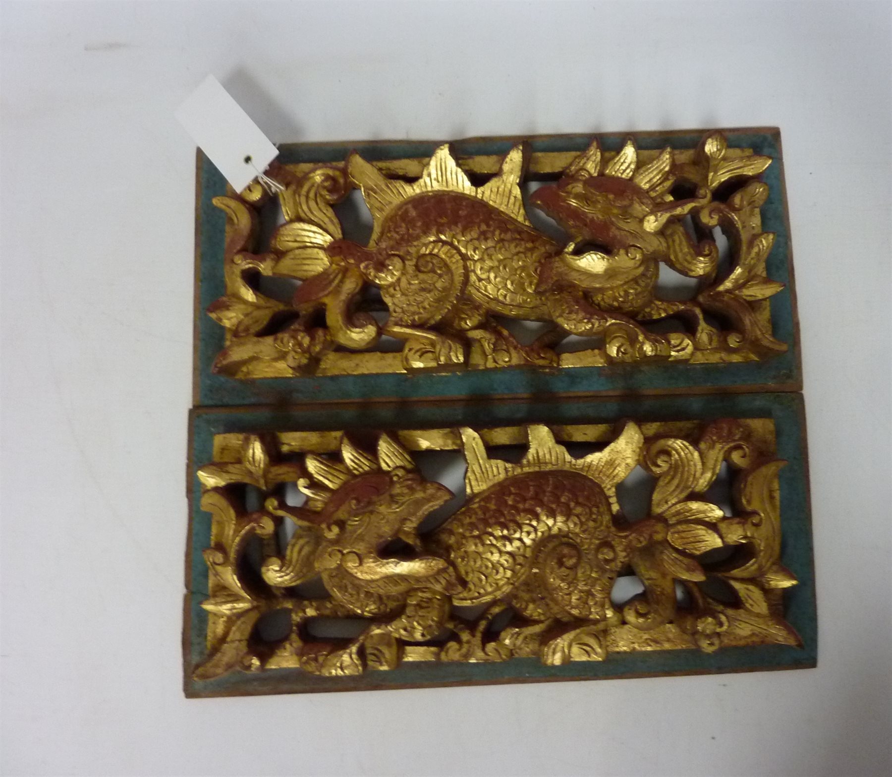Pair late 19th/early 20th century Chinese carved wood Peranakan wedding bed panels each decorated with a dragon