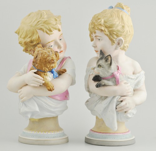 Pair of Austrian biscuit glazed half-length figures, of a boy with his dog and a girl with her cat