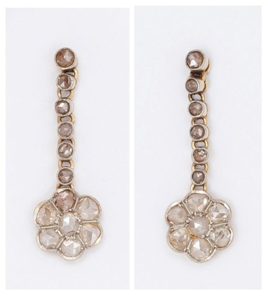 Pair of earrings in yellow gold and silver set with rose-cut diamonds. P. 3.7 g