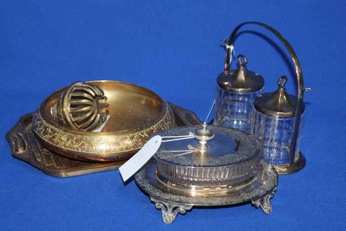 PAIR OF GLASS PRESERVE DISHES ON A PLATED STAND along with another glass dish on a plated stand, and a small group of brassware