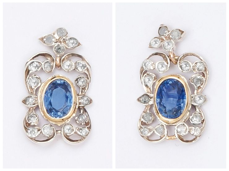 Pair of pendants in yellow gold and white gold openwork adorned with an oval sapphire and diamonds. P. 6.4 g
