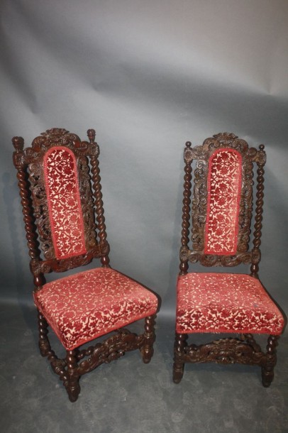 Pair of walnut chairs carved with crowns, foliage, flowers and foliage, upright and screwed base.