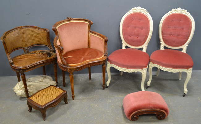and two walnut framed armchairs, one with pink upholstery, the other with cane (a/f), and two footstools (6)