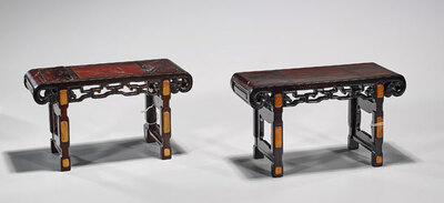 Pair of old Chinese miniature wood altar tables; each rectangular top with curved, scroll ends terminating in ruyi heads; with openwork aprons; the two supports featuring lighter wood panels; L: 10" (each, approx.)