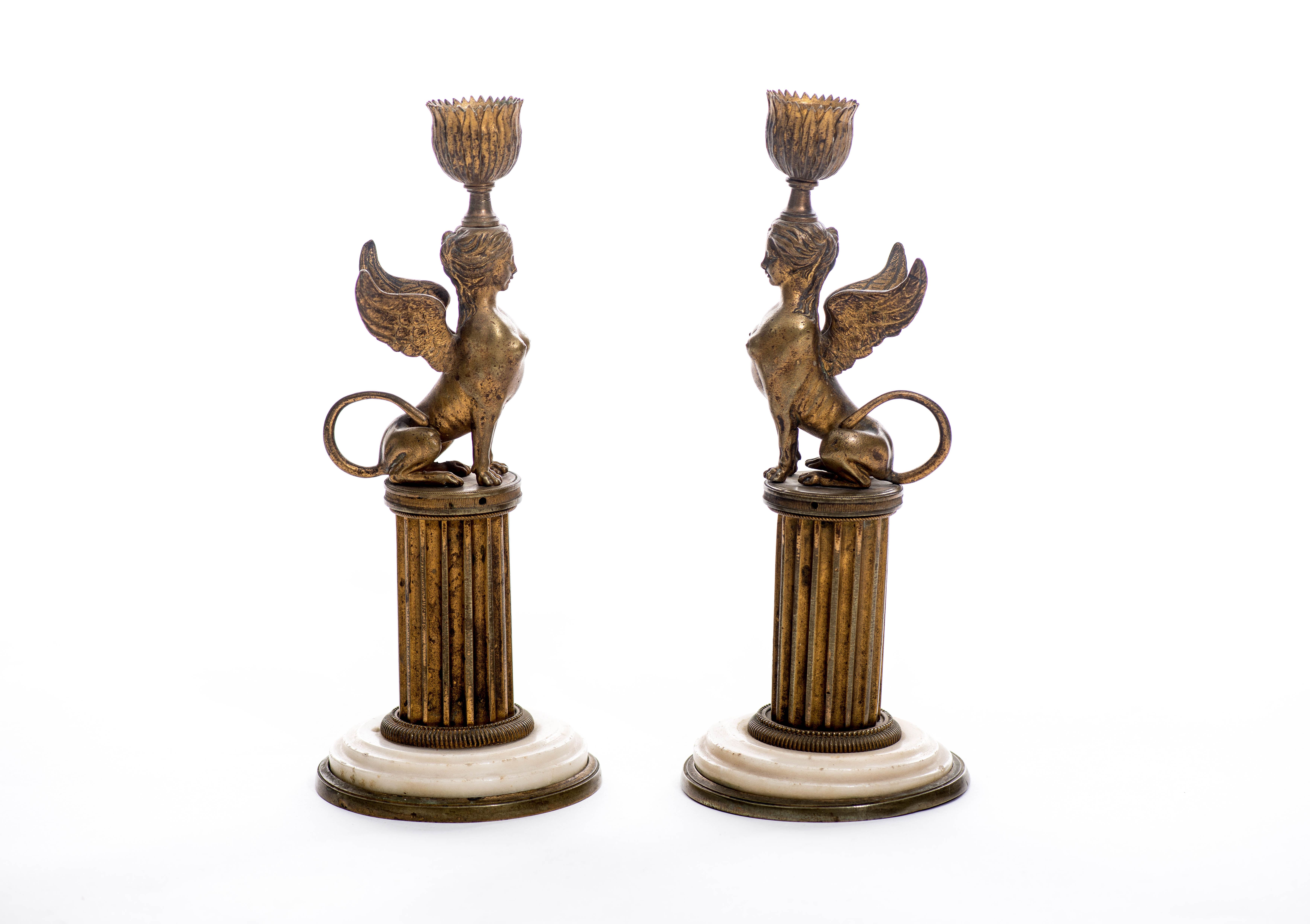 Paire de bougeoirs représentant deux sphinges en bronze surplombant une colonne cannelée sur un socle en marbre blanc. Style Empire.