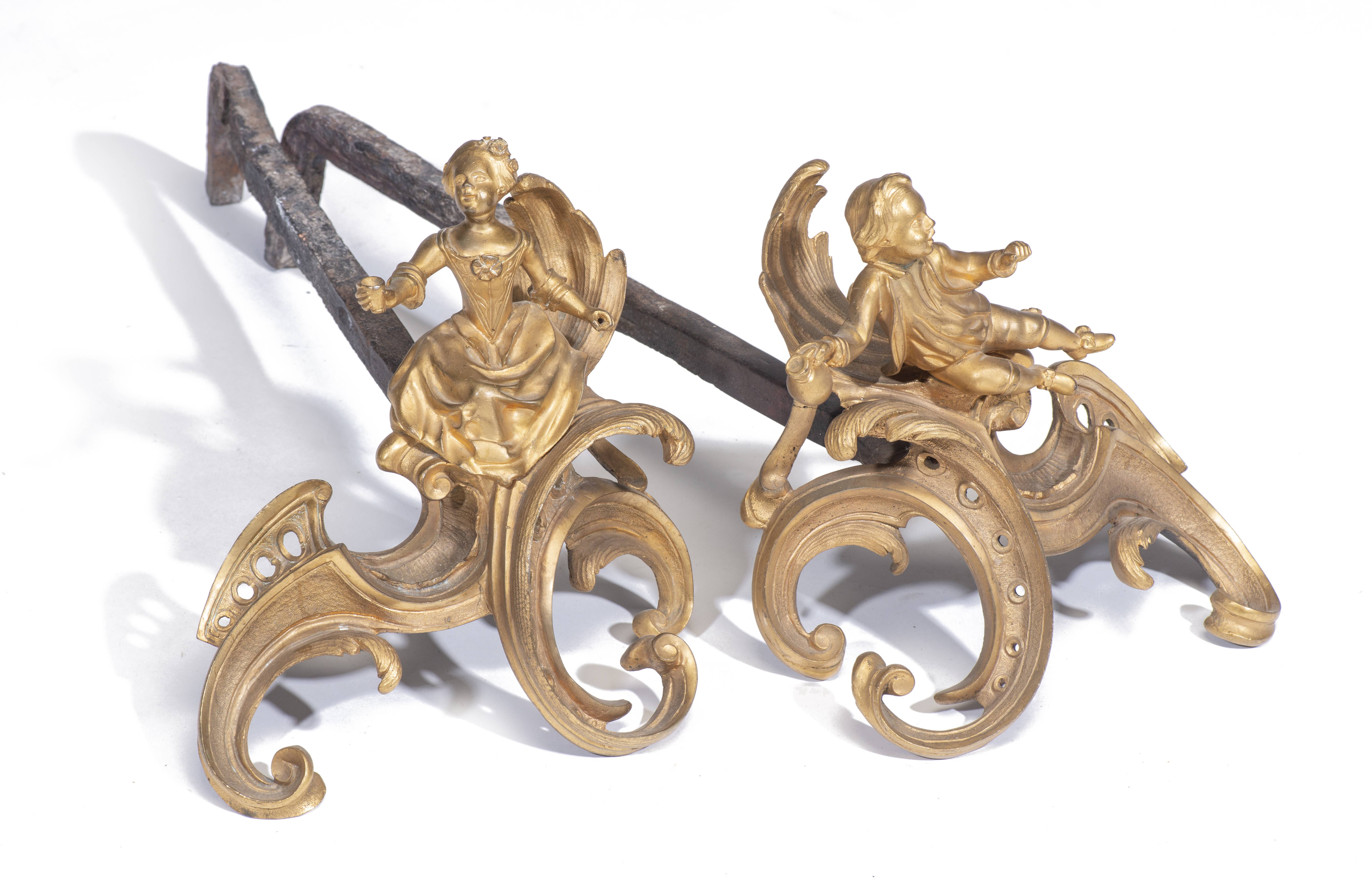 Paire de chenets de style Louis XV en bronze doré à décor d'une jeune fille tenant un verre et un garçon tenant une cruche, rinceaux de feuilles d'acanthe, vers 1900