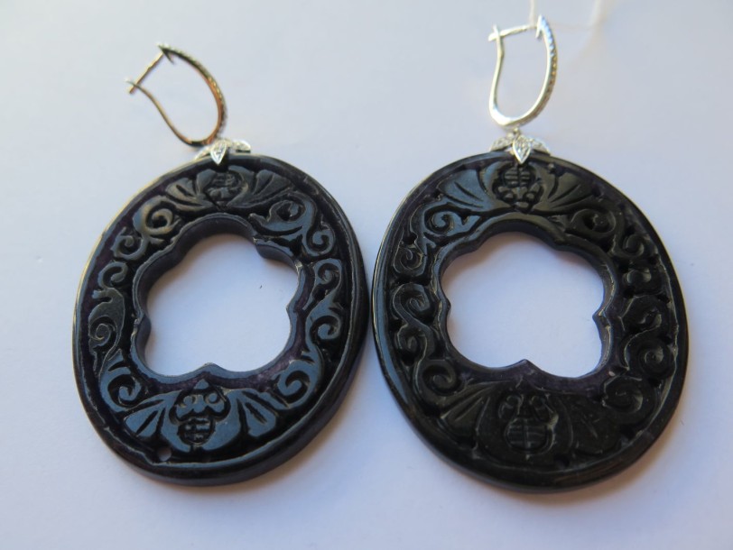 or gris ornés d'une ligne de petits diamants en pavage soutenant un disque de jade noir sculpté et ajouré d'un motif en trèfle. Brut : 17,79 g