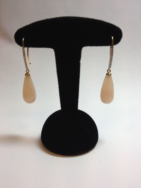 Paire de pendants d'oreilles en or jaune soutenant en pampille une goutte d'opale surmontée d'une ligne de petits diamants en pa