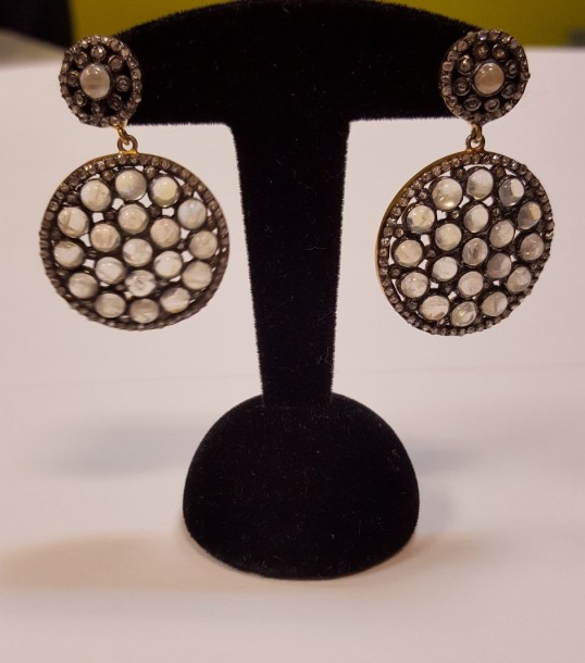 Paire de pendants d'oreilles en vermeil à deux motifs de forme ronde ornée de petits diamants en pavage autour de pierres de lun