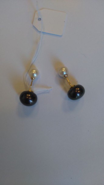 Paire de puces d'oreilles en or jaune ornées d'un coté d'une petite perle de culture et de l'autre d'une perle d'eau douce de Ta