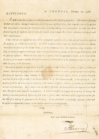 Printed Circular Letter Signed ("P. Henry") as Governor of Virginia, 1 p, 4to, In Council [Richmond, VA], February 20, 1786, some browning, some reinforcement visible at fold intersections, closed tear at lower edge. Matted and framed with engraved p