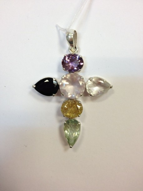 Pendentif croix en argent pavée de pierres multicolores. Brut : 13.06 g