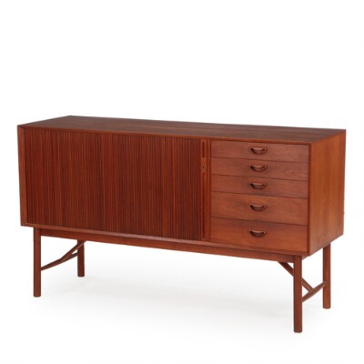 Sideboard of solid teak with visible joints, front with five drawers and tambour door, behind which shelves