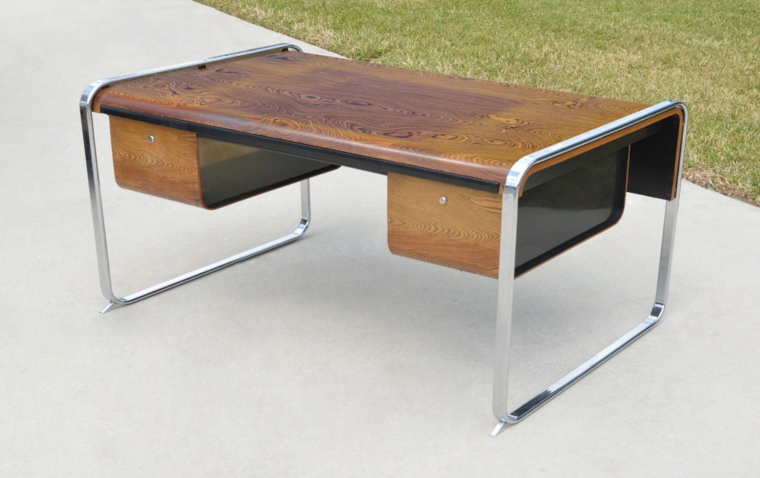 bent African zebrawood and chromed steel construction. Shallow compartmented center drawer, file drawers either side