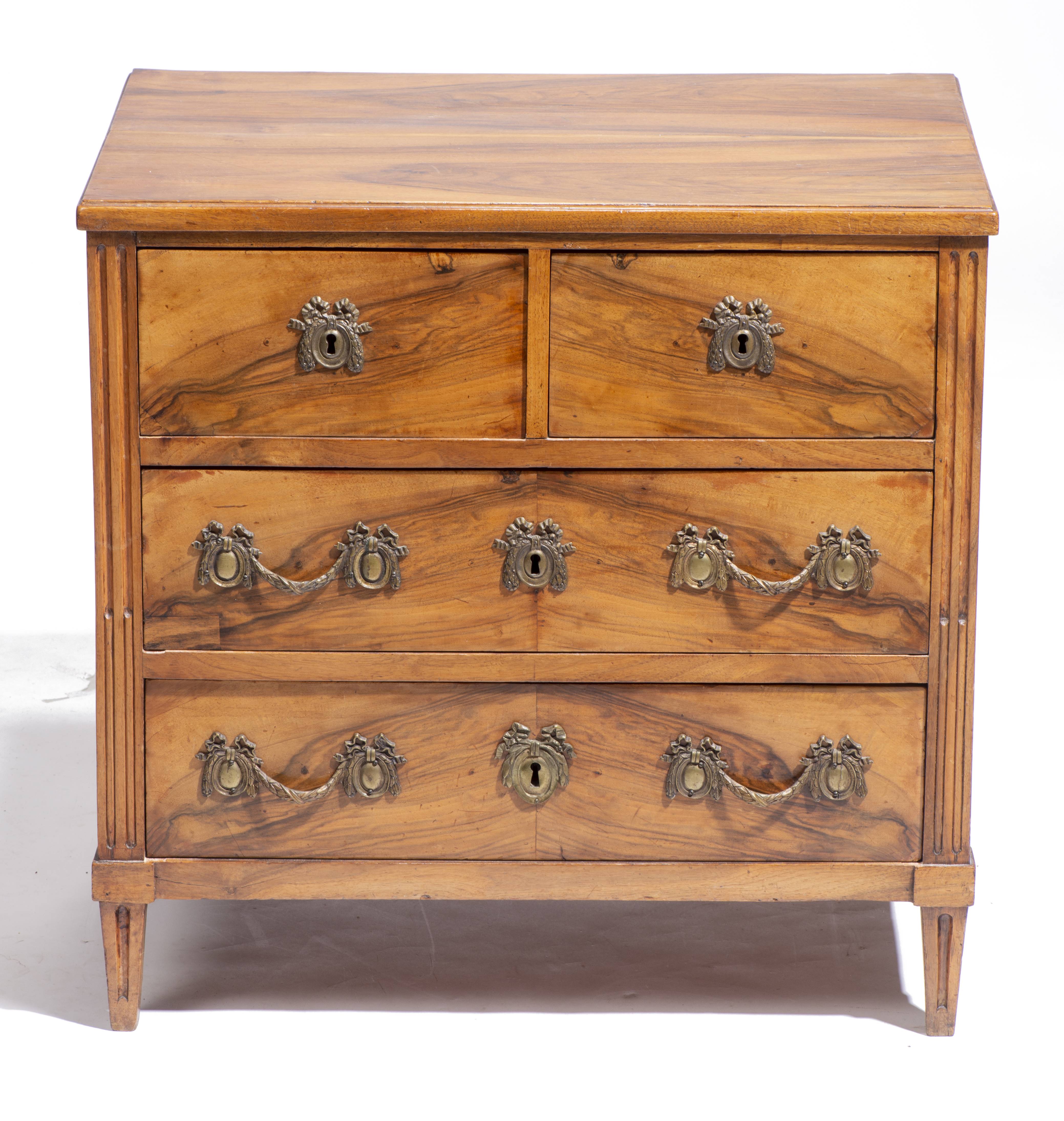 Petite commode d'époque Louis XVI suisse (XVIII-XIXe) en placage de noyer, 4 tiroirs et côtés en caisson, plateau en bois.