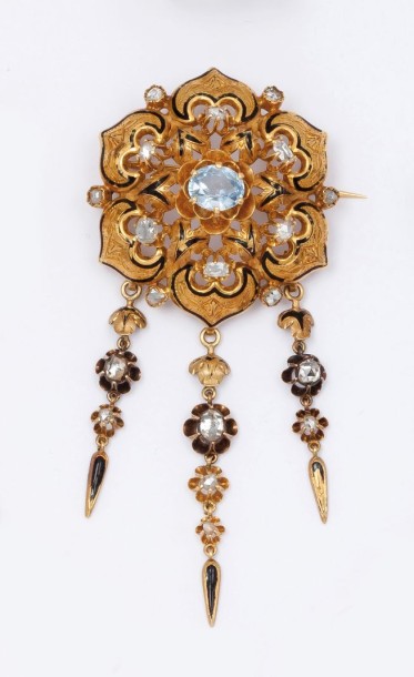 Pin openwork carved yellow gold, black enamel and set with rose-cut diamonds with a blue spinel