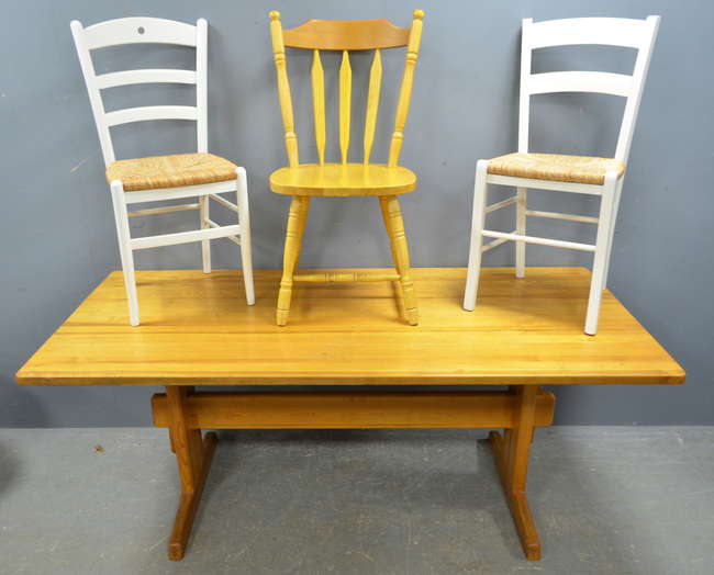 Pine kitchen table on twin end supports, two painted chairs and one other chair